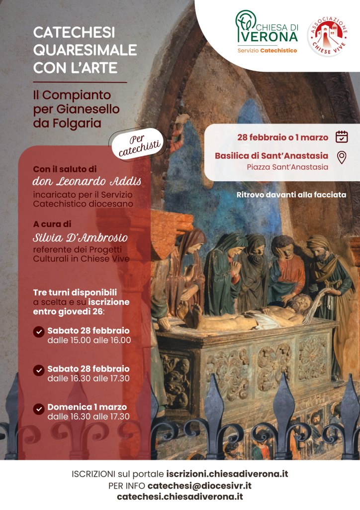 Tornano gli incontri di pastorale con l’arte pensati insieme all’Associazione Chiese Vive e rivolti ai catechisti di tutta la Diocesi di San Zeno: dedicheremo l’incontro quaresimale al “Compianto per Gianesello da Folgaria“ che si trova nella basilica di Santa Anastasia (con ritrovo all’esterno, davanti alla facciata).